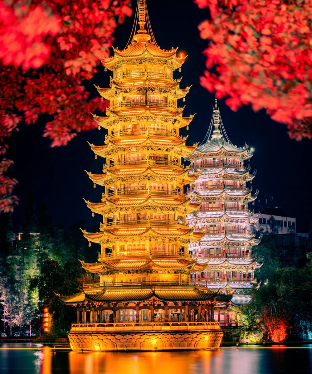 The Two Rivers (Li River and Peach Blossom River) and Four Lakes (Wood Lake, Gui Lake, Banyan Lake and Cedar Lake) form the core water system of Guilin’s urban area. After the urban renovation project, it has become a beautiful scenic belt integrating natural water scenery and cultural relics. The scenic area includes ancient buildings such as the Sun and Moon Twin Towers. The Moon Tower is made of copper, and the Sun Tower is inlaid with glass, which are particularly dazzling at night. Taking a night cruise, visitors can pass by ancient bridges and traditional dwellings, enjoying the unique charm of Guilin, a “water city” in southern China.